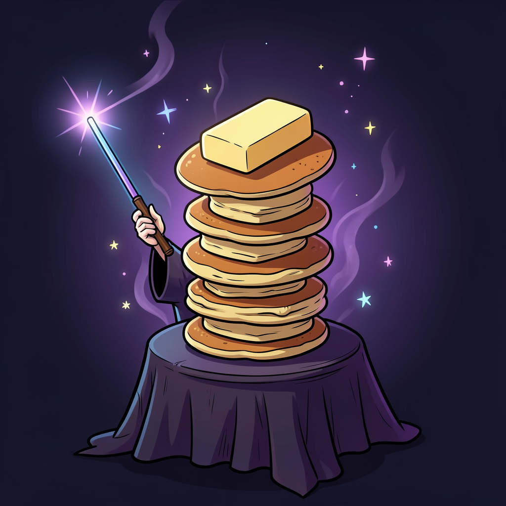 5 stacked pancakes butter on each behind a wizard only showing wand and hand on magic table and star