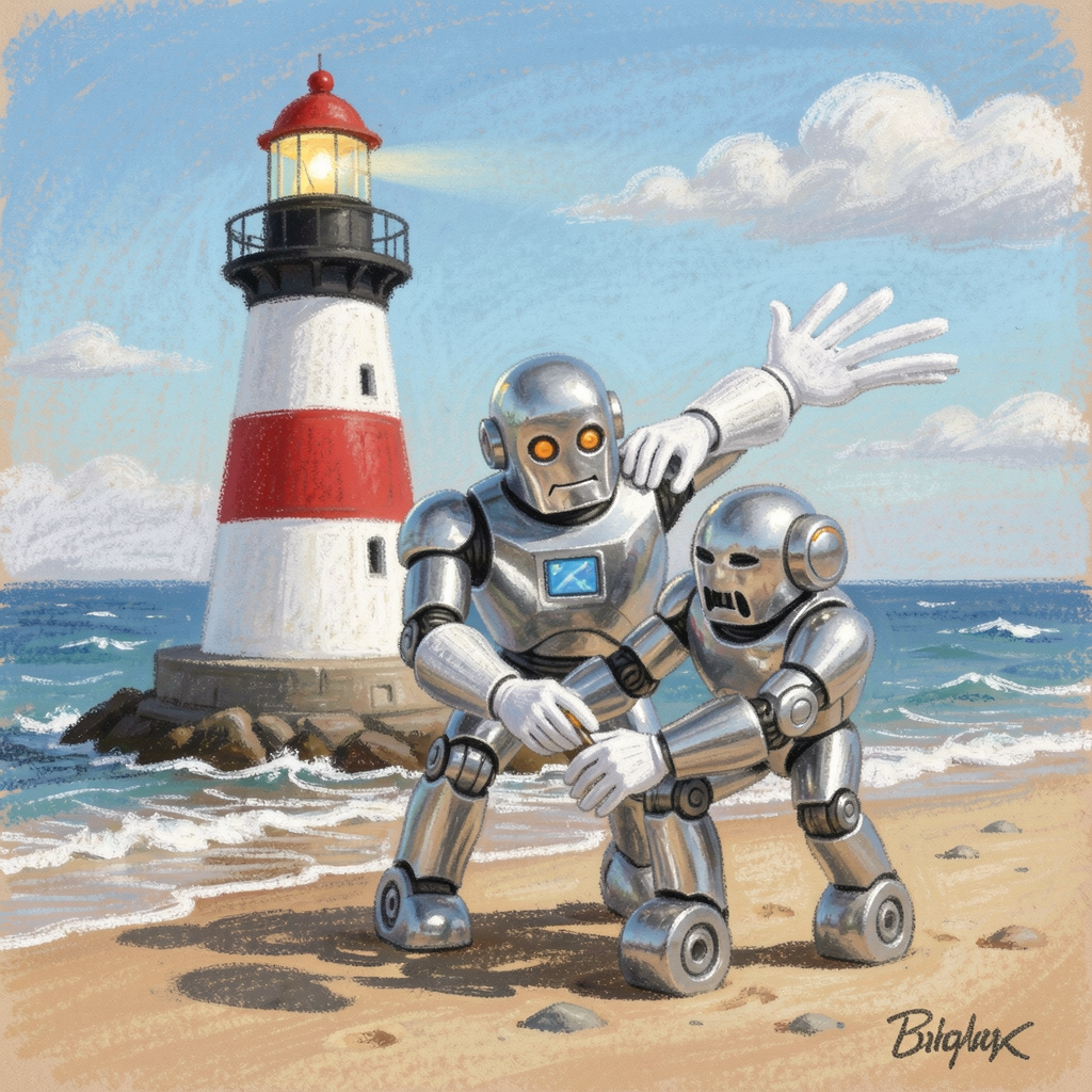 Robot with three white hands on beach helping a smaller robot walk, red & white lighthouse behind