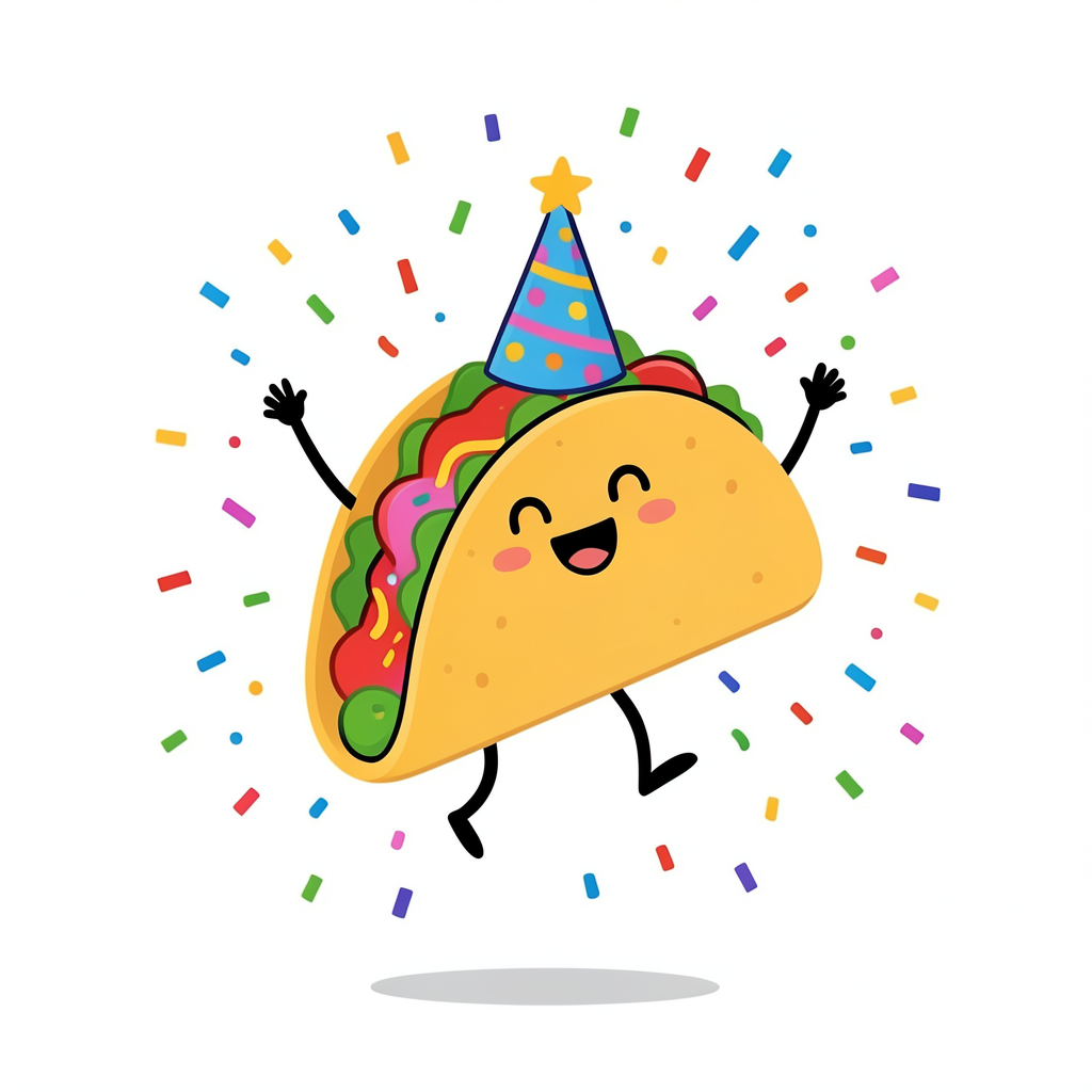 Minimalist art: a happy taco wearing a party hat and jumping for joy in colorful confetti.