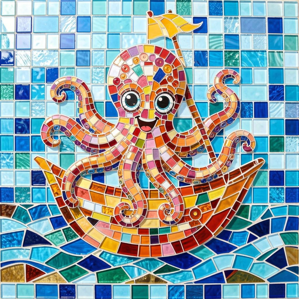 A cheerful mosaic octopus sails a tiny boat, glowing in bright tiles against a sparkling blue sea.