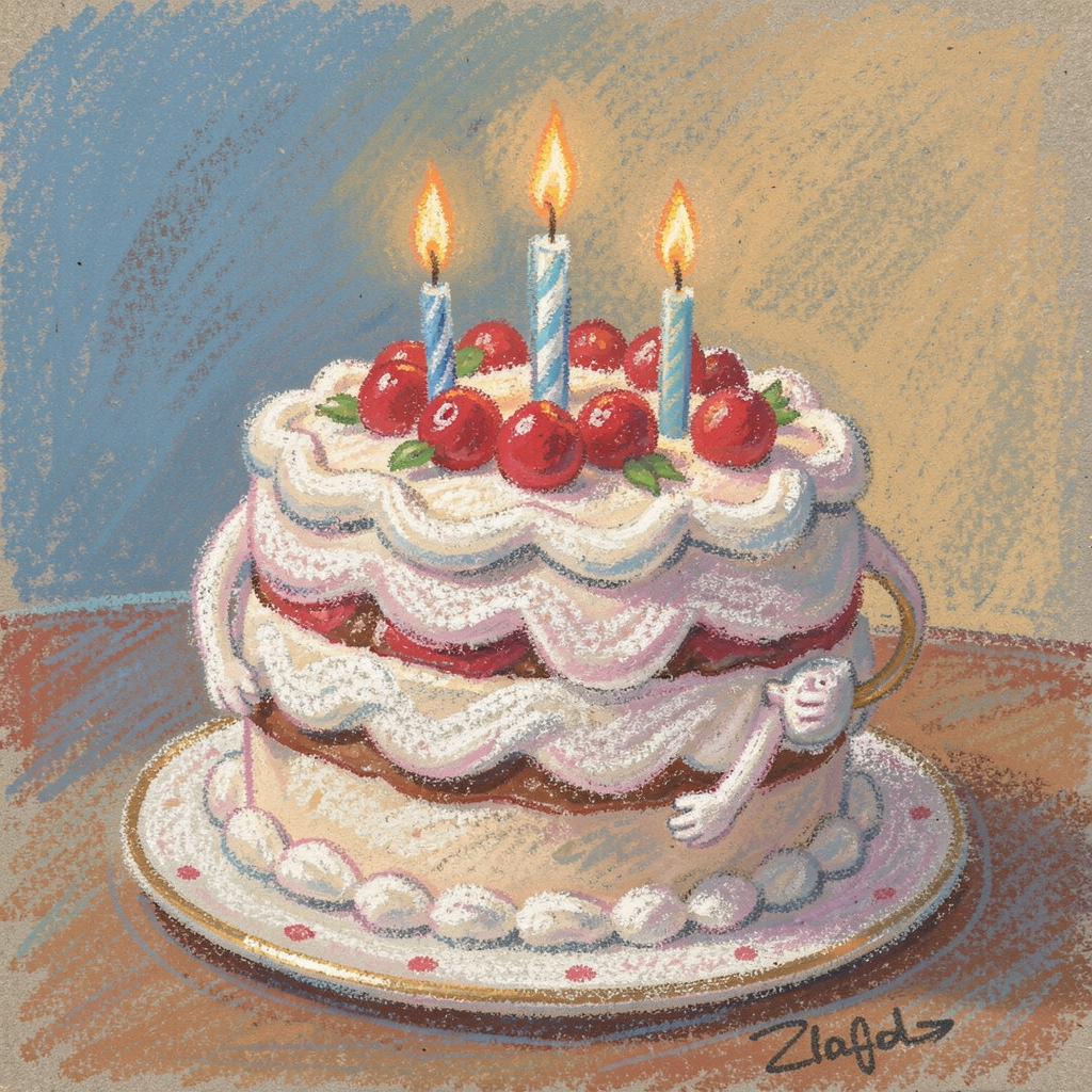 Pastel image of a layered vanilla cream & red berry cake with 2 tiny arms on a plate,3 candles.