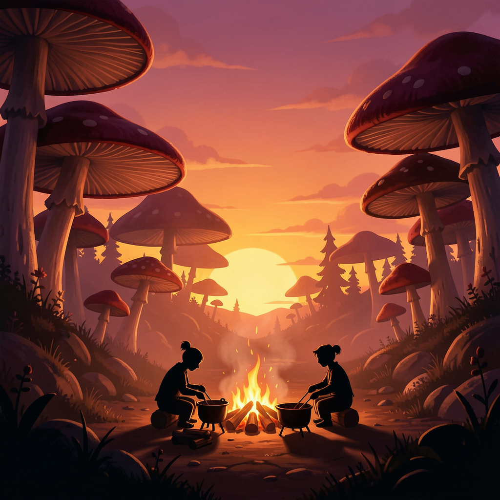 a sunset with big mushrooms as trees and to girls shadow making soup with a fire